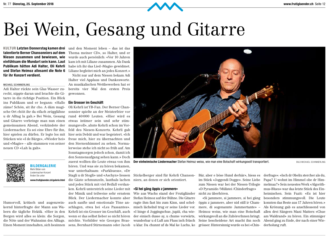 Oli Kehrli wird kommenden Donnerstag, 20. September, um 20.00 Uhr beim Berner Liedermacher Gipfeltreffen seine Chansons auf dem Niesen erklingen lassen. Mit dabei sind auch die beiden Liedermacher Stefan Heimoz und Adi Halter.