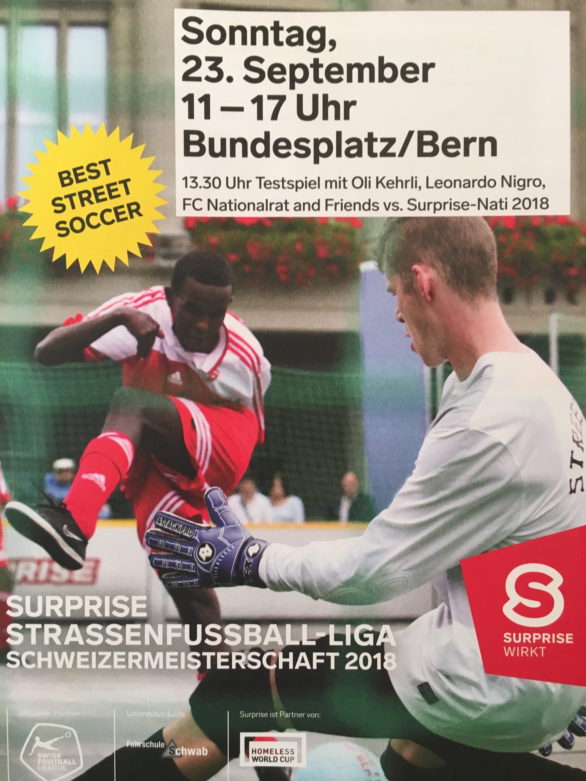 Ob der Berner Chansonnier mit dem runden Leder auch so geschickt wie mit den Wörtern jonglieren kann, seht ihr kommenden Sonntag, 23.9 um 13.30 Uhr auf dem Bundesplatz in Bern. Dann spielt er zusammen mit dem Schauspieler Leonardo Nigro und dem Nationalrat im All-Star-Team gegen die Streetsoccer-Nationalmannschaft.