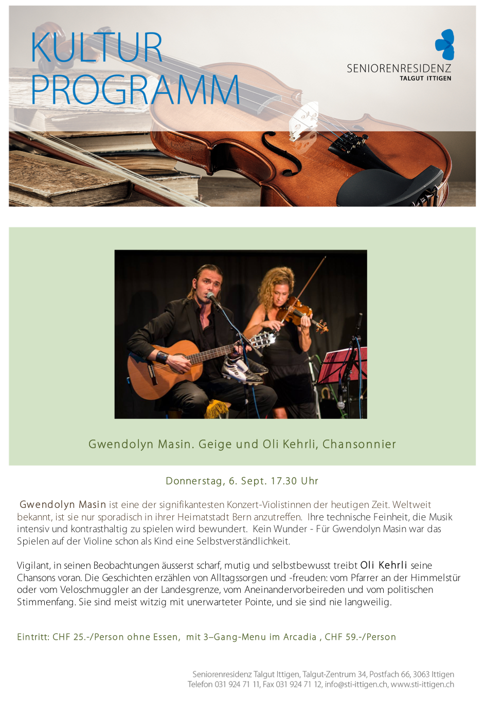 Diesen Donnerstag, 6.9, 17.30 Uhr kommt es im Talgut Ittigen zu einer Wiederkehr des Duoprogramms mit Konzertviolinistin Gwendolyn Masin.